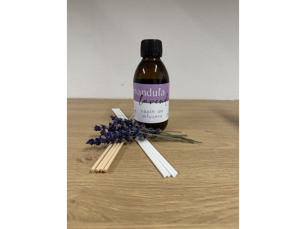 Náplň do difuzéra obsahuje prírodný levanduľový esenciálny olej z odrody Lavandula × intermedia ‘Grosso’, pestovanej a destilovanej priamo na našej farme v Ružindole.