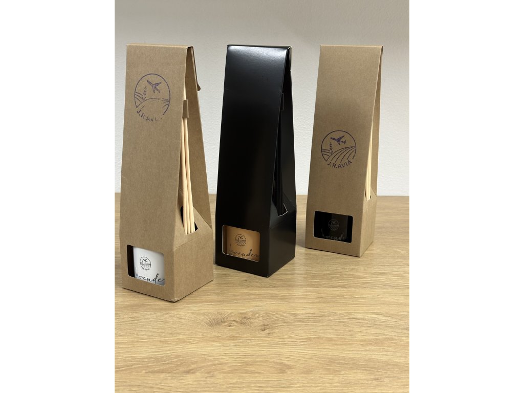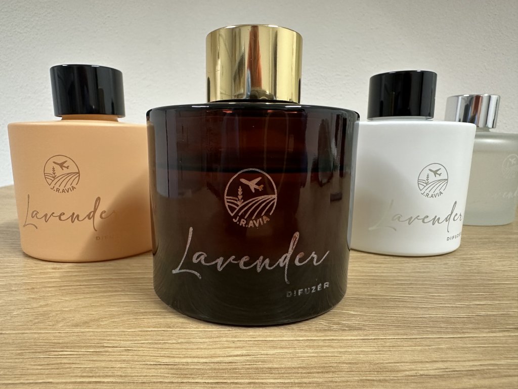 Prírodný interiérový difuzér s vôňou čistého levanduľového oleja z rodinnej farmy J.R.Avia prináša do priestoru jemnú vôňu levanduľových polí.