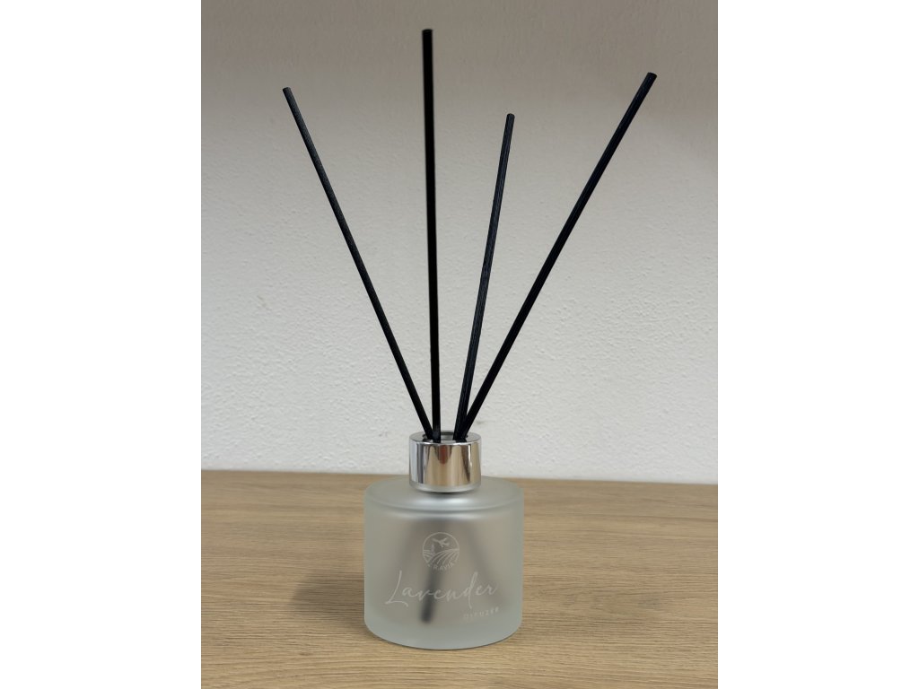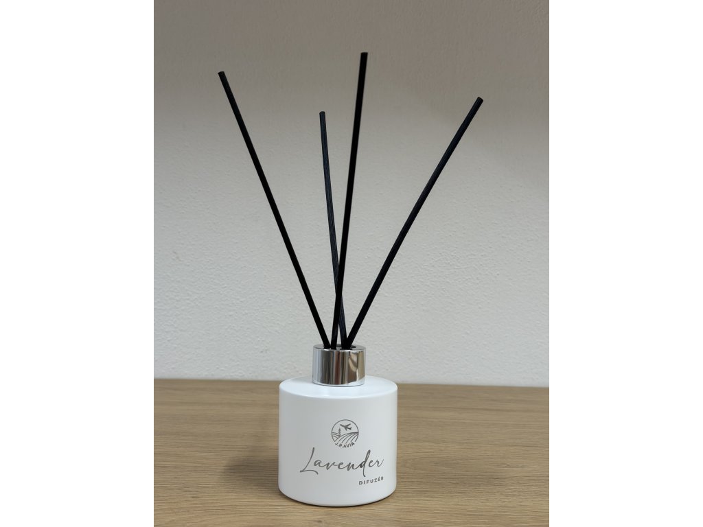 Difuzér obsahuje prírodný levanduľový esenciálny olej z odrody Lavandula × intermedia ‘Grosso’, pestovanej a destilovanej priamo na našej farme v Ružindole.