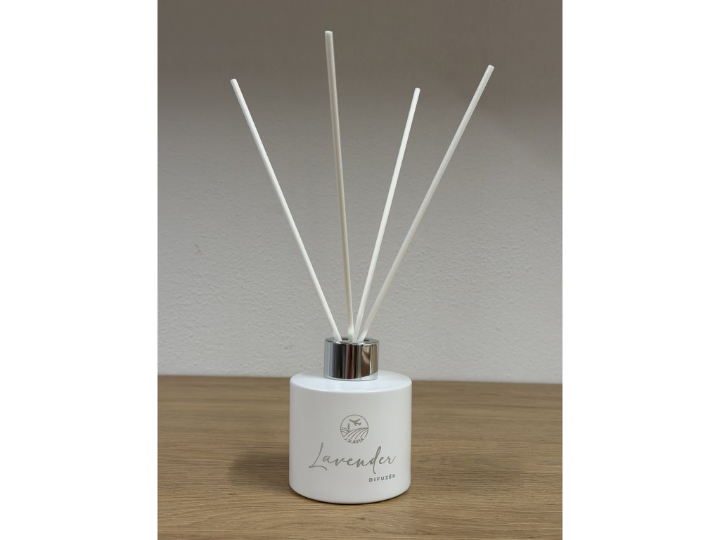Prírodný interiérový difuzér s vôňou čistého levanduľového oleja z rodinnej farmy J.R.Avia prináša do priestoru jemnú vôňu levanduľových polí.