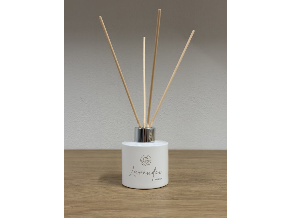 Levanduľový difuzér s drevenými tyčinkami – prírodná vôňa z farmy J.R.Avia
